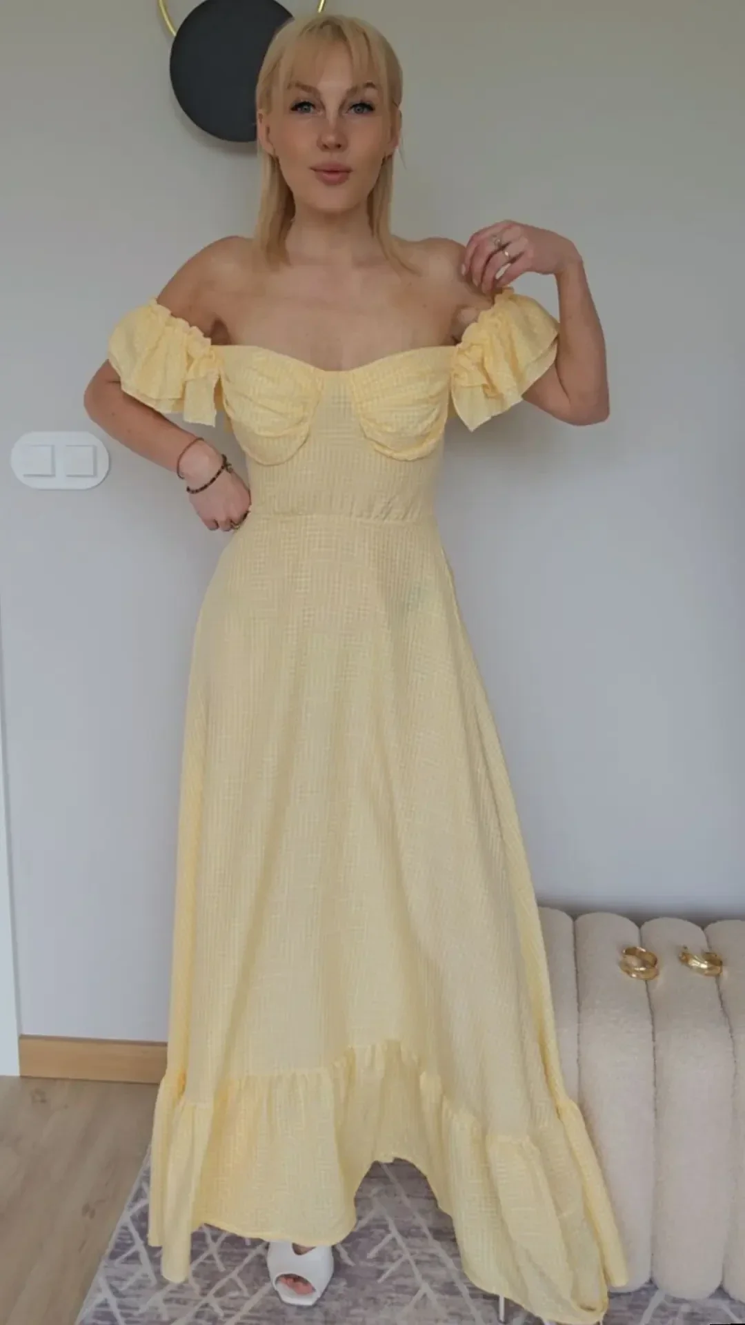 Długa sukienka w delikatną kratkę to idealna propozycja na ciepłe dni. Zmysłowy dekolt typu hiszpanka pięknie eksponuje ramiona, a falbankowe rękawki dodają lekkości i romantycznego charakteru. Dopasowana góra podkreśla talię, a zwiewny dół z falbaną sprawia, że całość wygląda niezwykle dziewczęco i świeżo ✨